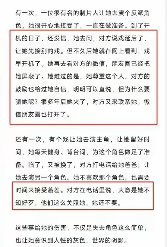 当时她都已经进组签了合同了,没想到副导演通知她,角色换成了投资方的女儿。